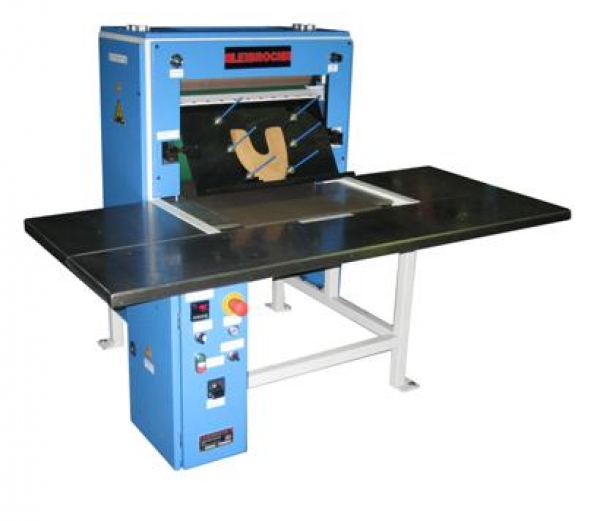 Maszyna przeznaczona do prasowania cholewek i podszewek z jednoczesnym odkładaniem gotowych elementów w stosie.